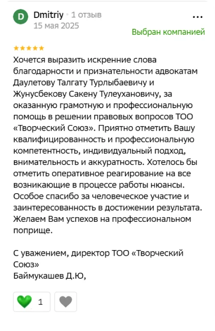 Мы всегда стремимся профессионально расти и совершенствоваться. Постоянно следим за изменениями в казахстанском законодательстве, участвуем в юридических семинарах и конференциях. Проходим специализированные курсы по повышению квалификации и набираем ценный опыт в различных отраслях права.